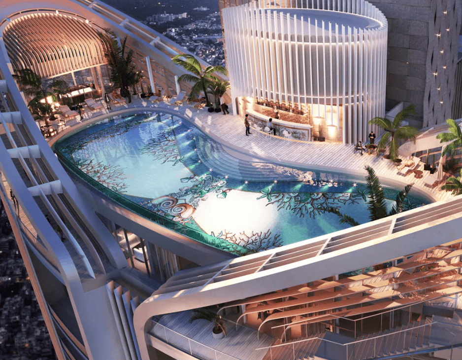 Grand balconies with skyline views.